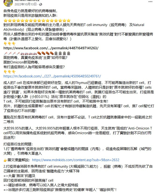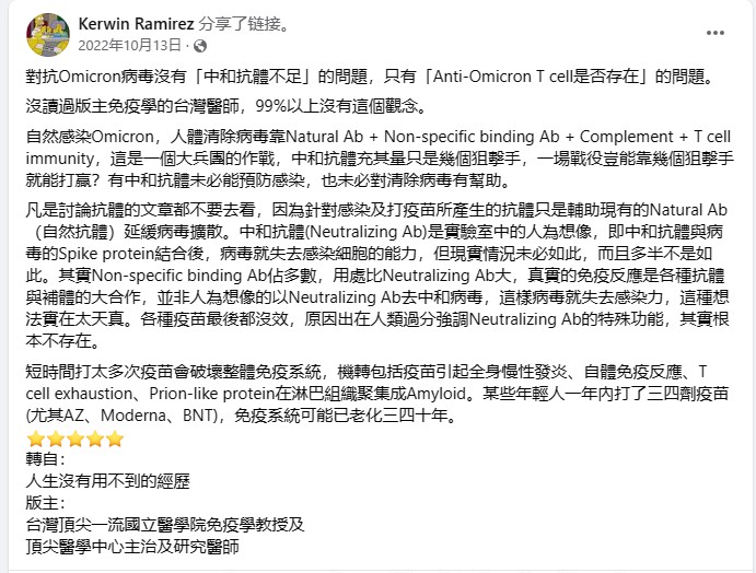 成人的Thymus已萎缩,打疫苗不会产生新的T cell来对抗新冠病毒,天生有Anti-Omicron T cell,不必打疫苗,天生若没有,打了也没用(既不会产生Anti-Omicron T cell,也不会产生Anti-Spike protein Ab),感染Omicron必遭天择。老人打新冠疫苗,会破坏免疫平衡,造成免疫力下降,更容易因感染其它细菌或病毒而死亡。打三剂BNT疫苗造成IgG4提升100倍,让人惊讶这些人该怎麽面对未来的人生,尤其是30岁以下的年轻人及儿童。