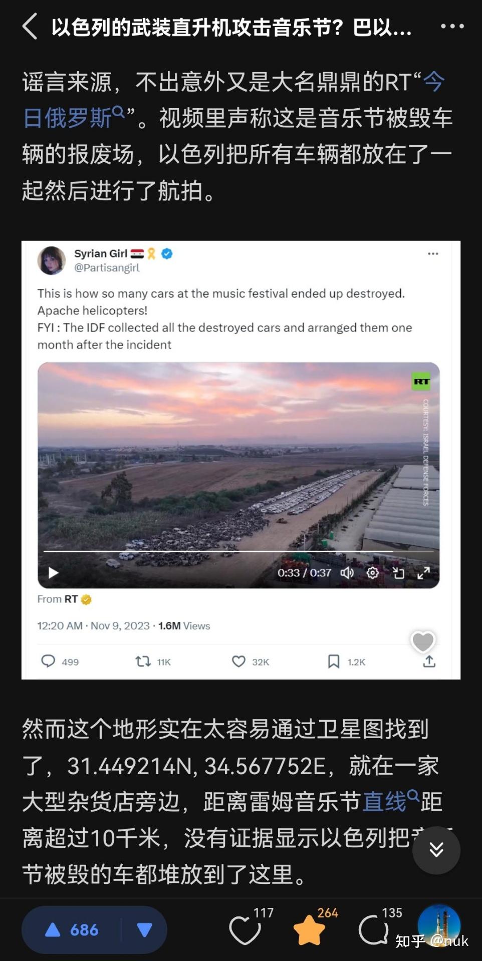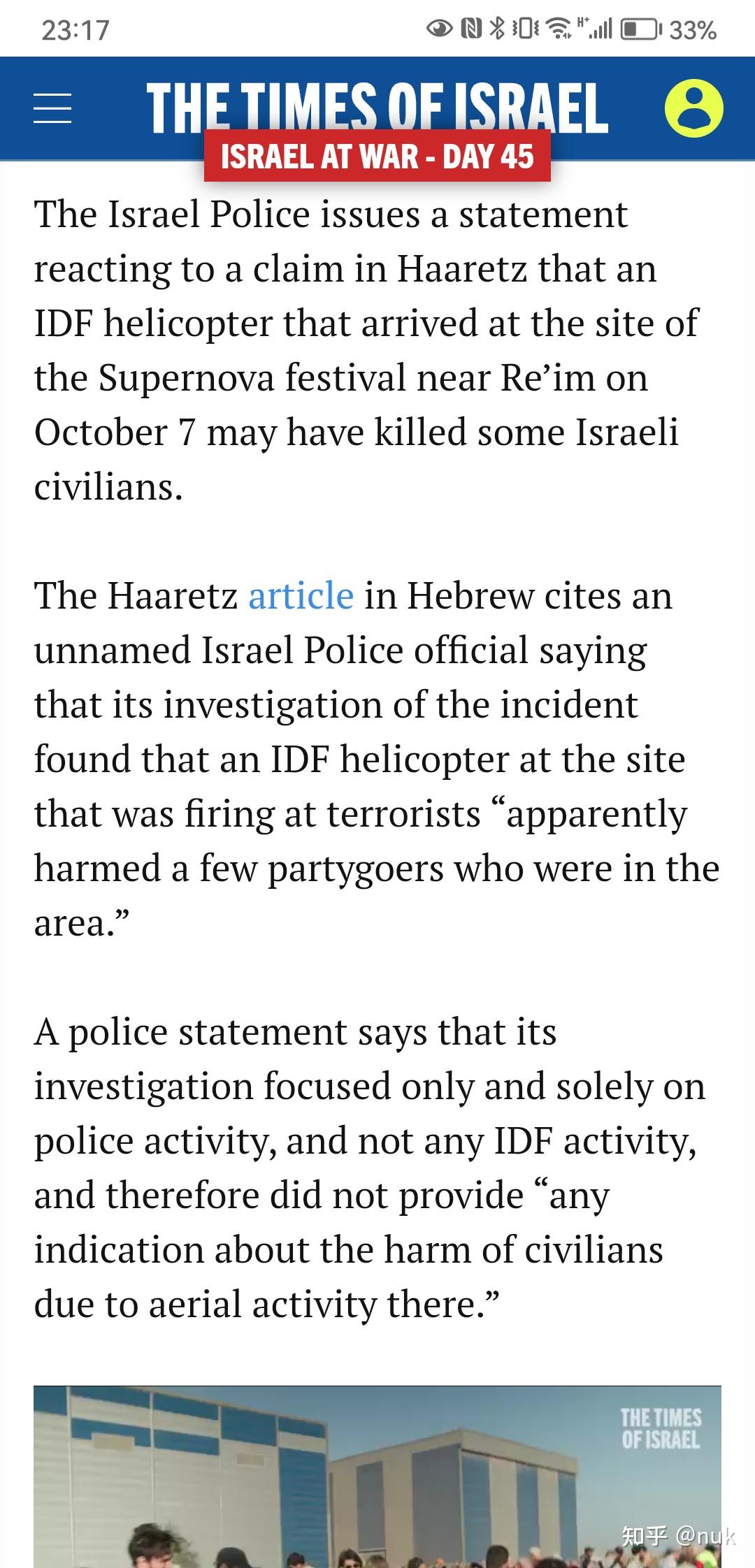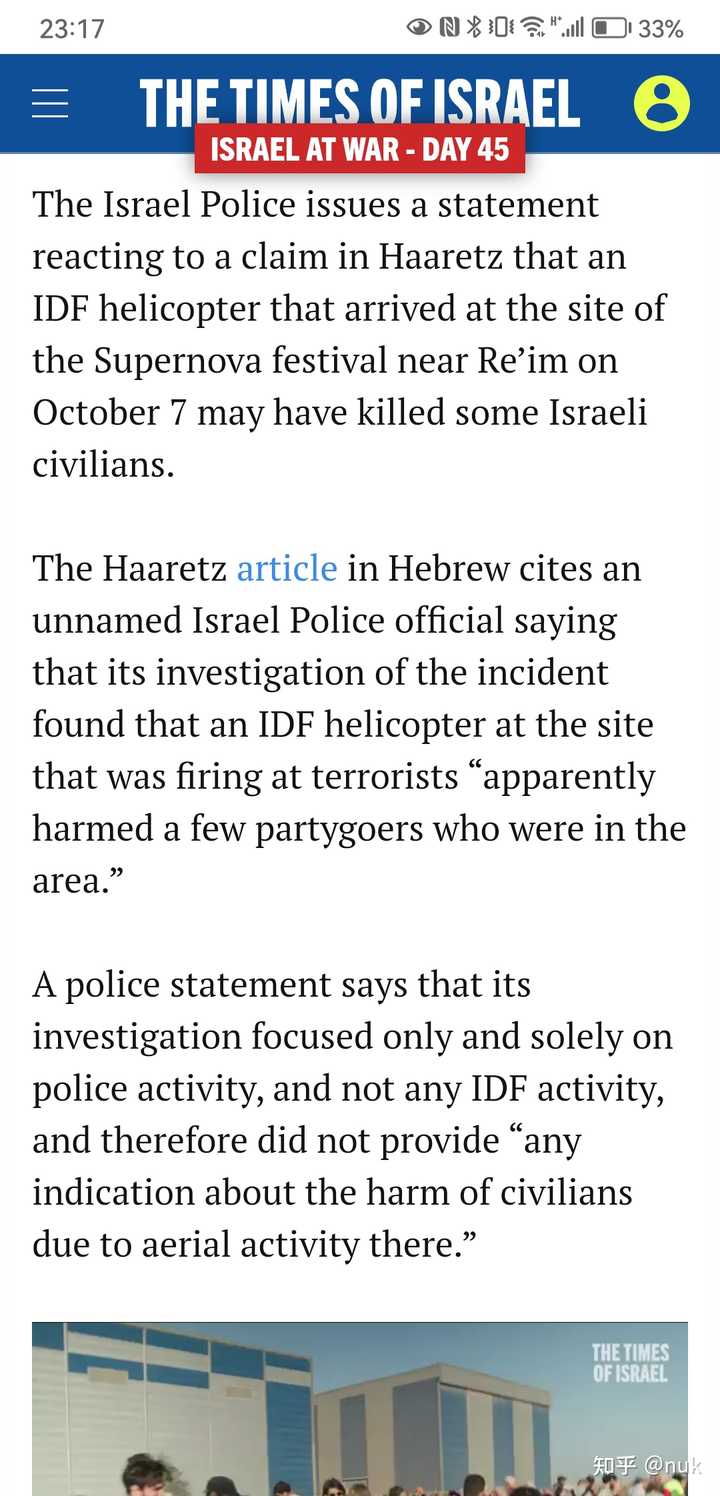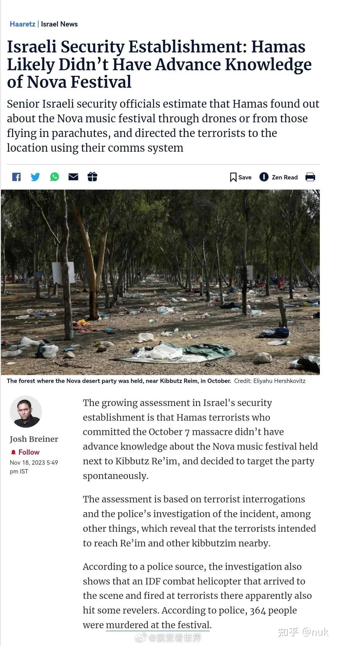 这里Saturn V也搬来同样的逻辑。<img src="https://picx.zhimg.com/50/v2-b35f1fb45e ... e=2c26e567" data-rawwidth="962" data-rawheight="1919" data-size="normal" data-caption="" data-original-token="v2-6b218ff6f4a4b77104f1ff511b101f65" data-default-watermark-src="https://picx.zhimg.com/50/v2-c588cee552 ... e=2c26e567" class="origin_image zh-lightbox-thumb" width="962" data-original="https://picx.zhimg.com/v2-b35f1fb45eddb ... 的方式就想无效化证物,他们就闻着味道不太对了。感觉这就是个被制造出来打击无差别射击论和各大支持巴勒斯坦账号信誉的事件。3. 国土报(Haaretz)的文章:也就是这个问题里说的文章。<img src="https://picx.zhimg.com/50/v2-f9b1a0c0ba ... e=2c26e567" data-rawwidth="1080" data-rawheight="2070" data-size="normal" data-caption="" data-original-token="v2-f05449854f772ae5fed27da56f890a54" data-default-watermark-src="https://picx.zhimg.com/50/v2-dd384709cf ... e=2c26e567" class="origin_image zh-lightbox-thumb" width="1080" data-original="https://pic1.zhimg.com/v2-f9b1a0c0ba6bb ... 过音乐节击杀恐怖分子,同时打到了一些平民。364个人在音乐节被杀。但应该不是说确认364人被直升飞机杀死。只是在场一共有364人被杀。<img src="https://picx.zhimg.com/50/v2-262b342722 ... e=2c26e567" data-rawwidth="1080" data-rawheight="2244" data-size="normal" data-caption="" data-original-token="v2-59a7c8476ef3e389047a3fc7fffe05e6" data-default-watermark-src="https://pic1.zhimg.com/50/v2-3cafdad65c ... e=2c26e567" class="origin_image zh-lightbox-thumb" width="1080" data-original="https://picx.zhimg.com/v2-262b342722f13 ... 时报道警察局官方回复,大意是说警察没有权限调查军队行为和为军队发言,所以那个警察的发言并不能代表官方。翻译成白话就是:警察个人说漏嘴的话我们不认。<img src="https://picx.zhimg.com/50/v2-aa83831b7f ... e=2c26e567" data-rawwidth="1080" data-rawheight="2244" data-size="normal" data-caption="" data-original-token="v2-6cd5cc403d1ca9504accdd33a351f9d0" data-default-watermark-src="https://pic1.zhimg.com/50/v2-e531902ba5 ... e=2c26e567" class="origin_image zh-lightbox-thumb" width="1080" data-original="https://pic1.zhimg.com/v2-aa83831b7ff21 ... 警察的话不能代表官方,也不具备调查军方的资格的时候,他们就是承认了这个警察说过这些话。他们选择撇开责任而没有说这个警察说的不对。这也很重要。现在我们知道飞机确实来过音乐节,打死了数量不详的人。它当然也会追击路上的车。我们统计的范围就大了很多。4. 我们再来看一下以色列官方的一次发言这个发言是因为他们11月7日终于发布了大屠杀死亡名单。结果它各种被找茬。于是以色列辟谣,修补。最后把死亡人数从1400下调到了1200并且解释。以色列官方发言关于名单和死亡人数:<img src="https://picx.zhimg.com/50/v2-73765d5aef ... e=2c26e567" data-rawwidth="962" data-rawheight="628" data-size="normal" data-caption="" data-original-token="v2-1bf303463bcd9c2958ecd727076b7d5f" data-default-watermark-src="https://picx.zhimg.com/50/v2-fec46c0463 ... e=2c26e567" class="origin_image zh-lightbox-thumb" width="962" data-original="https://picx.zhimg.com/v2-73765d5aef89b ... 始的数据是1400人(被屠杀)<img src="https://picx.zhimg.com/50/v2-23d52f68c8 ... e=2c26e567" data-rawwidth="962" data-rawheight="622" data-size="normal" data-caption="" data-original-token="v2-4d674cf3946a24d926c1561892a49644" data-default-watermark-src="https://picx.zhimg.com/50/v2-c8bbe97b8f ... e=2c26e567" class="origin_image zh-lightbox-thumb" width="962" data-original="https://picx.zhimg.com/v2-23d52f68c8824 ... 了1200人<img src="https://picx.zhimg.com/50/v2-f0ff1957fe ... e=2c26e567" data-rawwidth="962" data-rawheight="603" data-size="normal" data-caption="" data-original-token="v2-03668de03342e9a61361abbf665613fb" data-default-watermark-src="https://pic1.zhimg.com/50/v2-5f25990c9c ... e=2c26e567" class="origin_image zh-lightbox-thumb" width="962" data-original="https://picx.zhimg.com/v2-f0ff1957feac1 ... 因为有些躯体<img src="https://pic1.zhimg.com/50/v2-9bc9af274a ... e=2c26e567" data-rawwidth="962" data-rawheight="606" data-size="normal" data-caption="" data-original-token="v2-9a9113496eb40b79d7bd524a85cf0537" data-default-watermark-src="https://picx.zhimg.com/50/v2-3366cdd5b8 ... e=2c26e567" class="origin_image zh-lightbox-thumb" width="962" data-original="https://pica.zhimg.com/v2-9bc9af274ad2a ... 焚烧太过严重<img src="https://picx.zhimg.com/50/v2-5efe883d52 ... e=2c26e567" data-rawwidth="962" data-rawheight="596" data-size="normal" data-caption="" data-original-token="v2-39e796a5fb8ea78bfcbfa7da4e443976" data-default-watermark-src="https://pic1.zhimg.com/50/v2-84dd3524b8 ... e=2c26e567" class="origin_image zh-lightbox-thumb" width="962" data-original="https://pic1.zhimg.com/v2-5efe883d52f55 ... 们是我们的人<img src="https://picx.zhimg.com/50/v2-04f37403cf ... e=2c26e567" data-rawwidth="962" data-rawheight="604" data-size="normal" data-caption="" data-original-token="v2-22cebe8d1f93e8d4045efa6e0cbabab2" data-default-watermark-src="https://pic1.zhimg.com/50/v2-61d9baca1c ... e=2c26e567" class="origin_image zh-lightbox-thumb" width="962" data-original="https://picx.zhimg.com/v2-04f37403cfc3a ... 结果最后发现<img src="https://picx.zhimg.com/50/v2-e24e61f2ce ... e=2c26e567" data-rawwidth="962" data-rawheight="602" data-size="normal" data-caption="" data-original-token="v2-5e38ef30d49bb4a75479e0e07e069b6f" data-default-watermark-src="https://picx.zhimg.com/50/v2-f52a64a6f9 ... e=2c26e567" class="origin_image zh-lightbox-thumb" width="962" data-original="https://pic1.zhimg.com/v2-e24e61f2ce2eb ... 斯。这证明了几件事情:以色列分不清死掉的是哈马斯还是平民。以色列分不清射击的是哈马斯还是平民。这些人接受过阿帕奇地狱火或者坦克炮火之类的重武