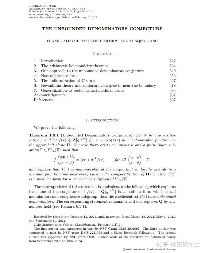 早在 2022 年,唐云清 就因在算术几何和数论领域做出的杰出工作而获得了当年的 SASTRA Ramanujan 奖. 在获得这一奖项的前一年,也就是 2021 年,她与 芝加哥大学 的 Frank Calegari,以及 加州理工学院 的 Vesselin Dimitrov 在预印本上发表了一篇题为 The Unbounded Denominators Conjecture 的文章,在这篇文章中,他们证明了重要的无界分母猜想:若 f(τ)∈Q[[q1/N]]f(\tau) \in \mathbb{Q} [[ q^{1/N} ]]f(\tau) \in \mathbb{Q} [[ q^{1/N} ]] 是一个对某些同余子群非模的模形式,则 f(τ)f(\tau)f(\tau) 的系数具有无界分母.经过 4 年 的漫长审稿,这篇文章终于在 2025 年 7 月 发表在知名数学期刊 Journal of The American Mathematical Society 上,意味着这一重要成果在数学界得到了广泛认可. 正是凭借这一成果,唐云清和 Frank Calegari 以及 Vesselin Dimitrov 共同获得了今年的 Cole 数论奖.<img src="https://picx.zhimg.com/50/v2-76761cbfa6 ... e=2c26e567" data-size="normal" data-rawwidth="668" data-rawheight="825" data-original-token="v2-a1d27d3f0b08c44f6c397b0a99dec146" class="origin_image zh-lightbox-thumb" width="668" data-original="https://pic1.zhimg.com/v2-76761cbfa6fa4 ... e567"/>唐云清 获 Cole 数论奖 的文章——The Unbounded Denominators Conjecture唐云清是第一个同时获得 SASTRA Ramanujan 奖 和 Cole 数论奖 的中国数学家!2024 年 8 月 27 日,唐云清又和 Frank Calegari 以及 Vesselin Dimitrov 在预印本上提交了一篇长达 218 页的文章:The linear independence of 1,1,1, ζ(2),\zeta(2),\zeta(2), and L(2,χ−3).L\left( 2,\chi{-3} \right).L\left( 2,\chi{-3} \right). 在这篇文章中,他们证明了L(2,χ−3)=1−122+142−152+172−182+⋅⋅⋅=0.781302412896⋅⋅ ⋅L\left( 2,\chi{-3} \right)=1-\frac{1}{22}+\frac{1}{42}-\frac{1}{52}+\frac{1}{72}-\frac{1}{82}+\cdot\cdot\cdot=0.781302412896\cdot\cdot\cdotL\left( 2,\chi{-3} \right)=1-\frac{1}{22}+\frac{1}{42}-\frac{1}{52}+\frac{1}{72}-\frac{1}{82}+\cdot\cdot\cdot=0.781302412896\cdot\cdot\cdot是无理数!除此之外,在这篇文章中他们还证明了 2π227±L(2,χ−3)2,\frac{2\pi2}{27}\pm \frac{L\left( 2,\chi{-3} \right)}{2},\frac{2\pi2}{27}\pm \frac{L\left( 2,\chi{-3} \right)}{2}, π218±5L(2,χ−3)8\frac{\pi2}{18}\pm \frac{5L\left( 2,\chi{-3} \right)}{8}\frac{\pi2}{18}\pm \frac{5L\left( 2,\chi_{-3} \right)}{8}都是无理数,以及 1,1,1, ζ(2)\zeta(2)\zeta(2) 和 L(2,χ−3)L\left( 2,\chi{-3} \right)L\left( 2,\chi{-3} \right) 是 Q \mathbb{Q} \mathbb{Q} 线性无关的. 如若证明无误,则这又是数学上的一项重大突破,必将载入史册!就在写这篇知乎的今天,唐云清又与合作者在预印本上提交了一篇关于 Shimura 族 的文章: Infinitely many primes of basic reduction for some abelian fourfolds.